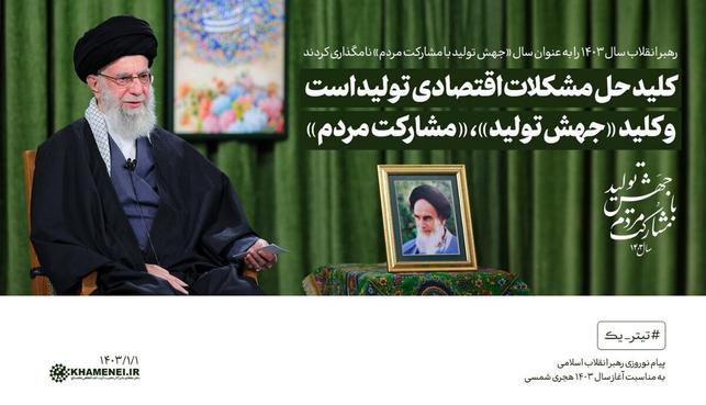 حضرت آیتالله خامنهای رهبر انقلاب اسلامی در پیامی بهمناسبت آغاز سال ۱۴۰۳، سال جدید را سال «جهش تولید با مشارکت مردم» نامگذاری کردند.